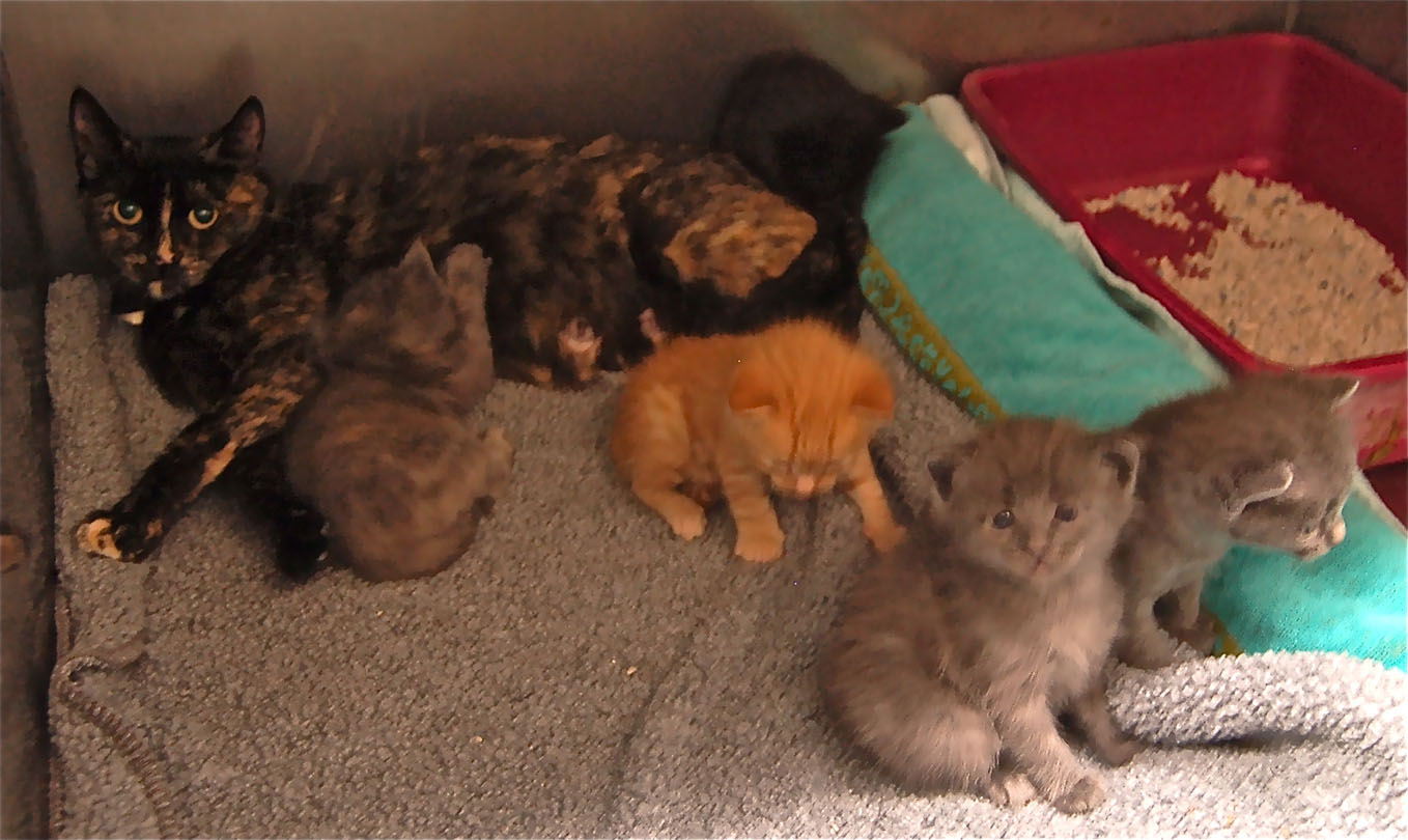 “CHABLIS IS BEING A GREAT MOM!” Well, everyone is doing very well two+ weeks later, and everyone at the Pet Hospital comments about what a good mother Chablis is. Of course, given that those who know here at the apartments say this is at least her 6th litter, I suppose being a great mother would be expected with all that practice of raising today about her 31st to 35th or so kittens.
